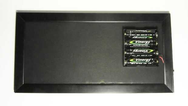 Instale el soporte de la batería en la parte posterior de la cartulina con pegamento o clavos pequeños. Asegúrese de usar un marcador permanente negro para ennegrecerlos vez doblada sobre o añadir otra capa de cartón negro delgado entre el vidrio y el cartón grueso para ocultarlas.