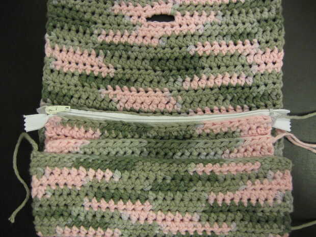 Utilizar hilo para iniciar en la parte inferior de cada lado. Alinee los bordes de cada panel y libremente (no demasiado apretado) coser con una puntada del azote los bordes laterales juntos desde abajo en el borde superior donde termina el panel con cremallera. terminar y tejer en los extremos sueltos.