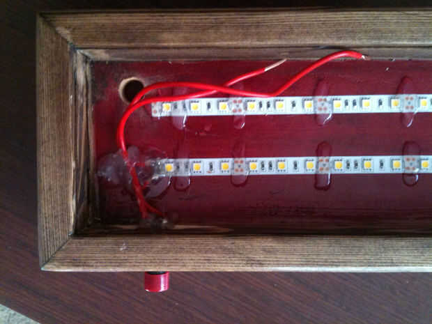 Taladre un agujero en la lámpara de tabla del forro para permitirle a los cables de alimentación a la fuente de energía. Los dos cables restantes (+ interruptor, tierra de tira del LED) a través del agujero y aplique sellador de silicona.