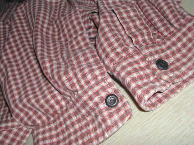 Y por lo que esta vieja camisa será reciclado en los siguientes cinco elementos; una diadema, ropa de la muñeca, servilletas, botones de repuesto y un pequeño maletín.