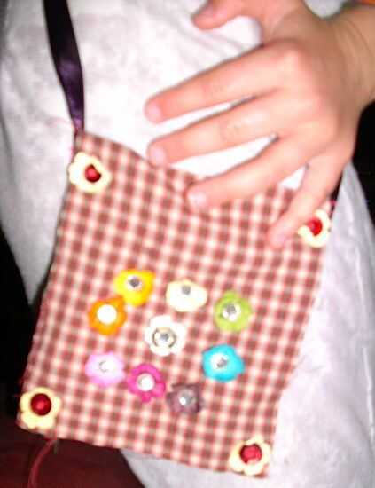ACTUALIZACIÓN: La bolsa era niño adornado con pétalos de flores de tela, lentejuelas, puntos de joya y una manija de la cinta. Cinta de gancho y lazo se añadieron a la aleta y la bolsa para el cierre. No se puede saber por esta imagen borrosa pero salio muy lindo!