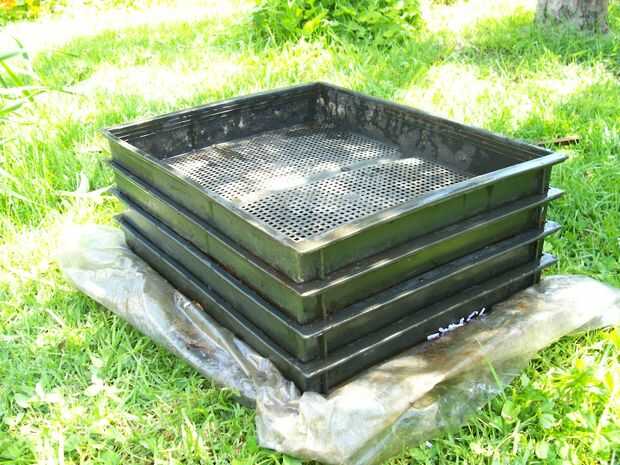 Esta imagen muestra el producto casi terminado. Tenga en cuenta el forro de plástico no tan cuidadosamente recortado, oscurecimiento de la bandeja de la Fundación. En los extremos, puede ver las costillas que las bandejas, dejando una pulgada o tan de espacio entre las rejillas de la parte inferior. Es donde van los alimentos, ropa de cama y gusanos.