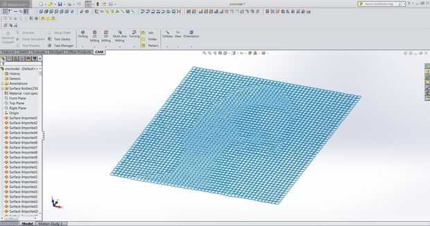 Iniciar Solidworks y abrir el. Archivo de SAT que ha creado. Esto puede tomar algún tiempo para Solidworks traducir la geometría. Una vez traducido debe tener un montón de superficies importadas. Si el modelo es gigante o pequeño, Dinamo puede tener sus mal las unidades. Si no es correcta, abra el archivo .sat en un editor de texto y mirar el primer número de la línea 3. Se trata de las unidades del modelo por milímetro. Si es algo distinto de 1, cámbielo y guarde el archivo.