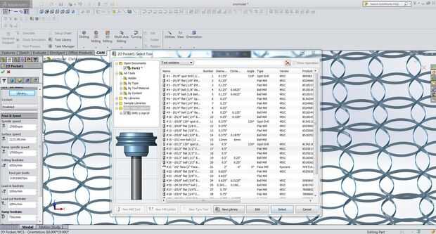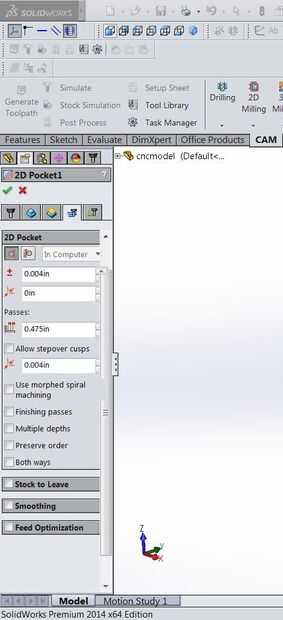 Ahora hacer un bolsillo 2d. Elegir una herramienta que es ligeramente más pequeña que tus círculos para que la herramienta tiene espacio para despejar el bolsillo. Para el mecanizado de acrílico, configurar la velocidad a 17.000 rpm y una velocidad de alimentación de corte de 100 ipm. Puse la rampa y hundir las velocidades de alimentación a 75 ipm.