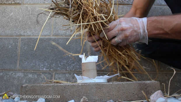 El rollo de papel se sienta sobre la parte superior, seguido de un calibre más pesado de Yesca. Como un manojo de pasto seco o paja.