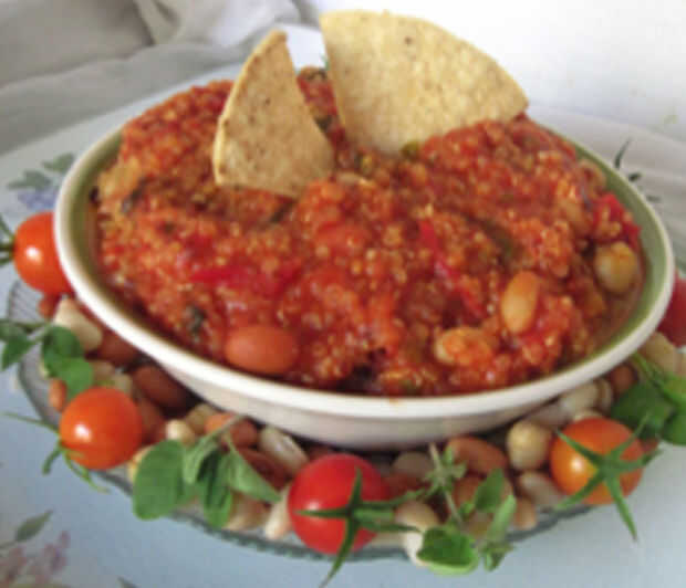 esta receta es la que llevó a una fiesta de trabajo la semana pasada y se entró en el concurso de cocina de Chile. Yo soy el único vegano en el trabajo, y ganó el 2do lugar :) Se basa en una receta similar que he creado llamado 3-quinua fabada (que entró en existencia a través de lo que uno se referiría como un "accidente feliz". Mayoría de las familias ha menús para ocasiones especiales y reuniones de vacaciones, pero no mi familia, es generalmente apenas pase lo que pase a sonar bien en el momento. Era Navidad 2007 creo cuando estaba tratando de hacer Chile para traer para la cena en la casa de mi abuela. Empecé a hacer, al darse cuenta, después de todo, las tiendas se cerró, que no tengo ninguna pasta de tomate (o tal vez sólo no es suficiente) a espesar para arriba suficientemente o incluso convincentemente pasar como Chile. Así que empecé a tirar cosas extra hasta espesar un poco, como quinua, extra TVP, zanahorias y todo lo que sucedió tener a mano.)