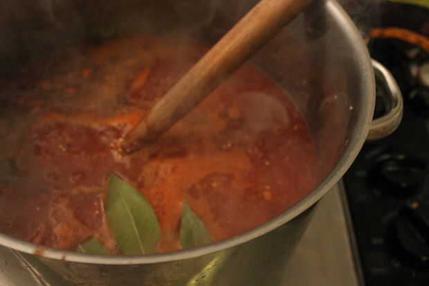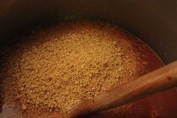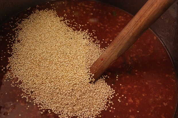 Añadir TVP y quinua, mezcle bien. Agregar cacao en polvo y cualquier condimentos restantes. Agregar hojas de laurel.