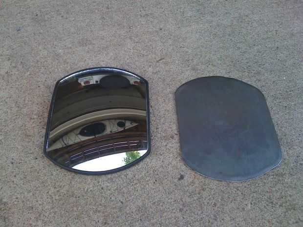 Cortar un trozo de chapa apenas más pequeño que el espejo. Observe el espejo tengo un vidrio curvo uno con 2 tiras adhesivas en la parte posterior para pegarse a espejos laterales de camión grande. Esto es importante porque elimina la necesidad de una bola de ajuste, de montaje en la parte posterior del espejo.