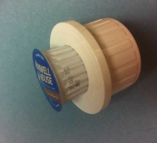 Mi primera build (vista arriba) vino a mí mientras pensaba en esto roaming la ferretería con una taza de K en varios tubos y accesorios. (Lo hice dibujando algún interés). Me pareció que una Unión de reparación de PVC de 1.5" el tamaño exacto necesario para capturar una copa K.