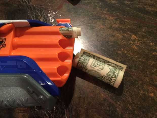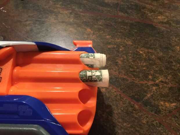Para este lugar simplemente acumulados de un proyecto de ley para que en el cañón de su arma de nerf, luego ponen. Esto funciona con casi cualquier arma.