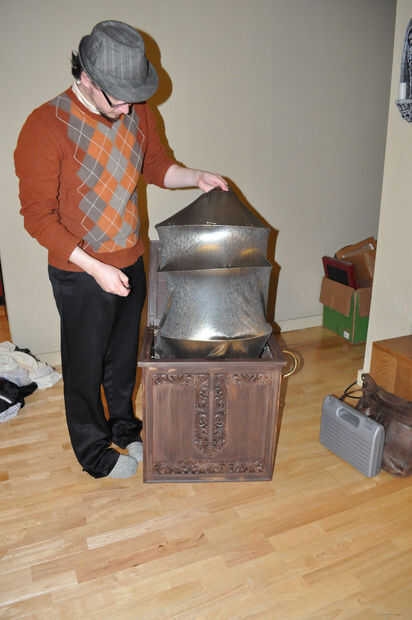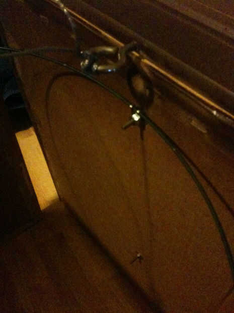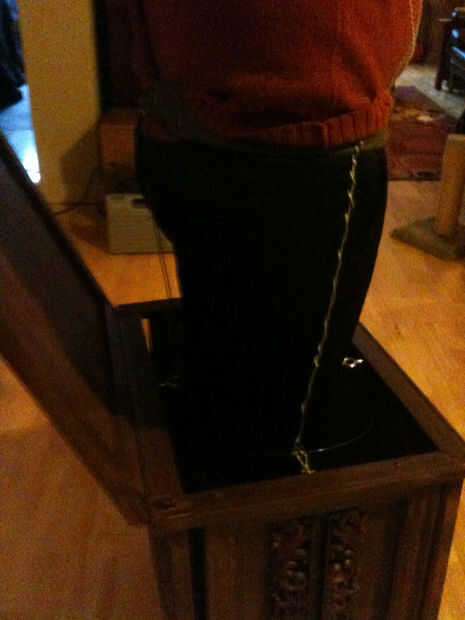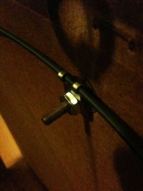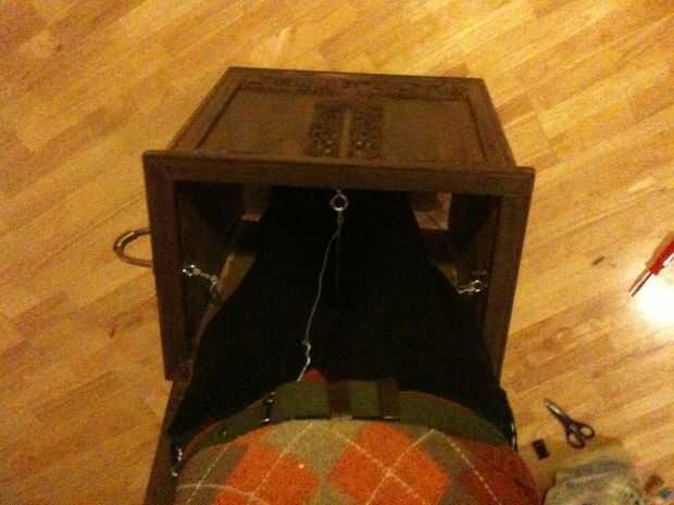 Con 4 ojales, tejió el marco a través de cada punto de anclaje de la anilla y conectado el cable de imagen a una banda de lona de cheapo encontré en Goodwill ($3) que tenía ojales perforados a lo largo de la correa que me permitió envolver el cable en la correa sí mismo. Tuve que hacer ajustes en la tirantez del cable de todos los lados (el alambre de vuelta requiere un poco más apoyo y tracción debido al peso de la tapa de la caja) para lograr una elevación uniforme en todos los lados de la caja.