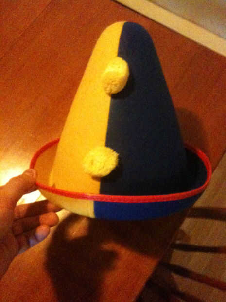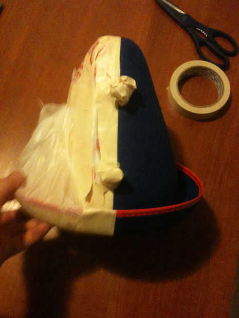 Ver, por desgracia para mí, este sombrero llegó sólo en dos opciones de color: amarillo/rojo o amarillo y azul. Puesto que el esquema de color para el resto de mi vestuario traje era verde, oro y tonos de marrón, el azul no iba a funcionar. Por lo que enmascara la porción amarilla y aerosol pintado el lado fieltro azul con una capa de color verde oscuro, luego una capa de pintura en aerosol verde brillante tenía flotando alrededor de un proyecto anterior.
