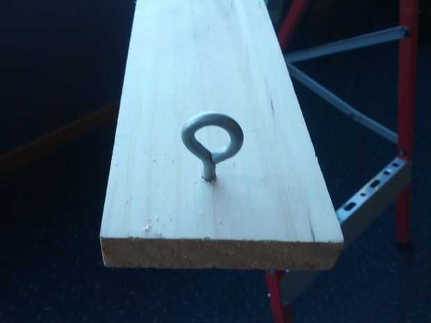 Taladrar un agujero cerca de ambos extremos de la madera y atornille los pernos de ojo.