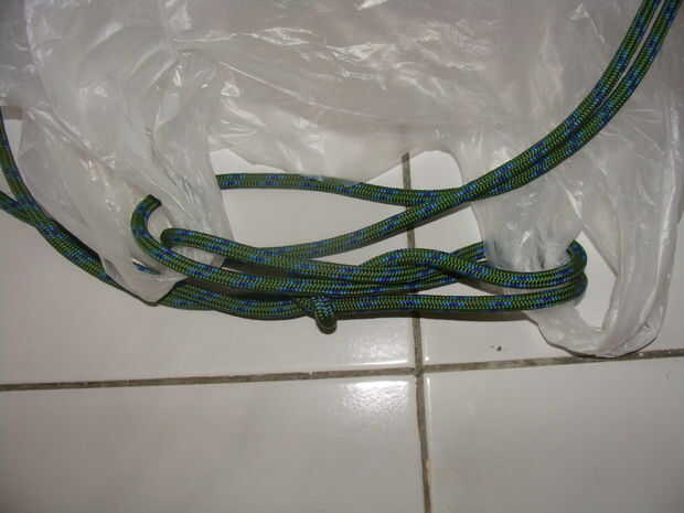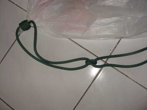 Si es lo suficientemente larga para pasar por las asas creo que esto podría ayudar a evitar que la cuerda en este punto de corte a través de la plástica. Si tienes mucha sobra, puede que desee amarrar para sellar la parte superior de la mochila nueva.