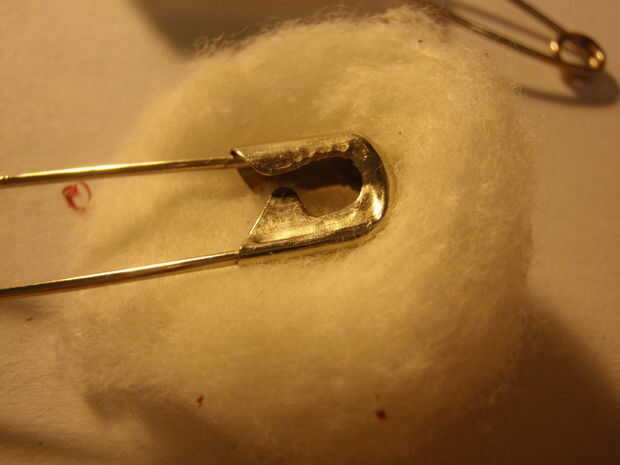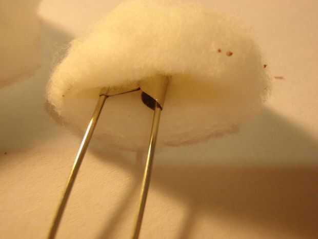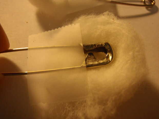 Si usted no quiere quemarse (la banda elástica no hará nada, excepto mantener los pernos de vuelo) luego tomar la bola de algodón y rasgar en dos partes. Luego, meter el pin en un "bolsillo" que cree metiendo el dedo en... algo así como cerámica... bueno supongo que es más como cottonery...
