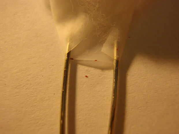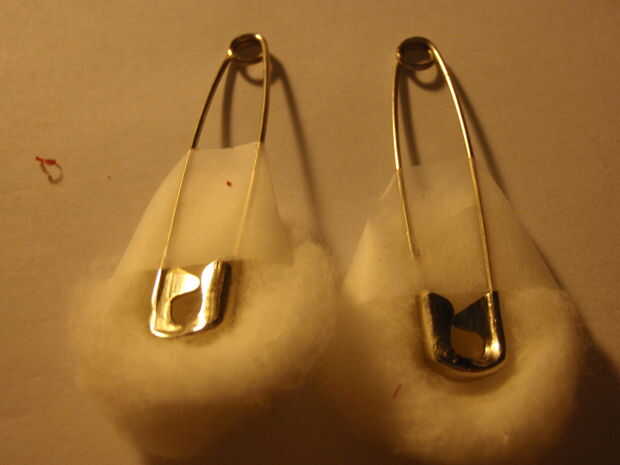 De cualquier manera, poner el perno de seguridad como en el tercer cuadro. Aplanar la cottonery y descansar el perno de seguridad en él como en la cuarta foto. Luego cinta adhesiva hacia abajo sobre el algodón con un trozo de cinta doméstica regular como en la foto quinta y sexta. Entonces, como en el séptimo cuadro, dos de ellos.