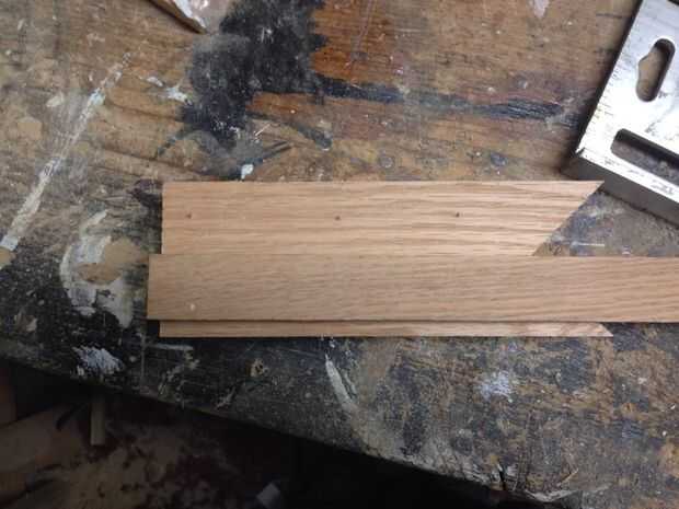 Voltea la pieza y hacer lo mismo con su larga recta pedazo de chatarra, pone abajo a la derecha en la línea de centro de dos piezas angulares, pegamento y seguro abajo con clavos.