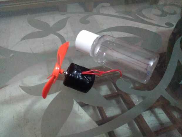 Añadir a continuación el motor conectado con el ventilador a la botella mediante cinta.