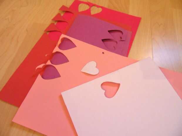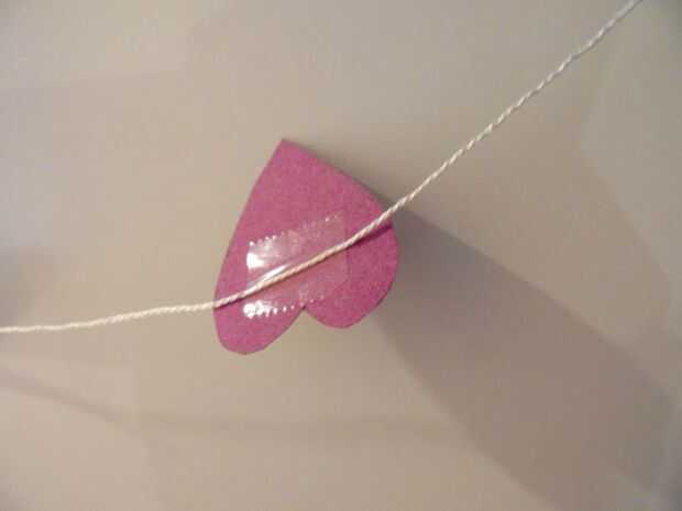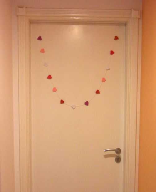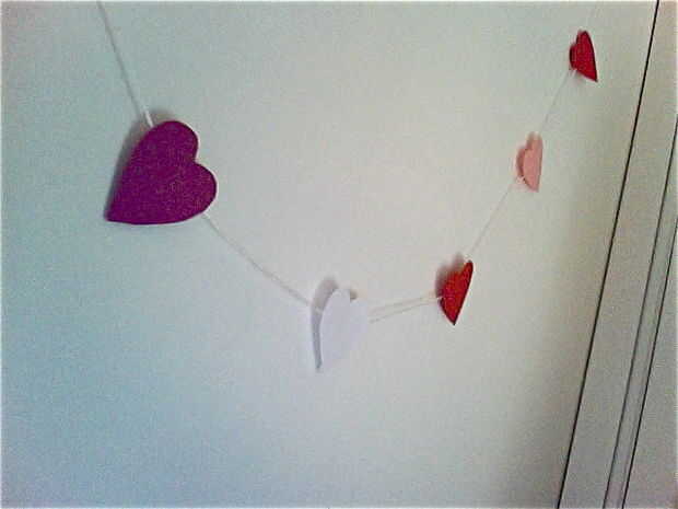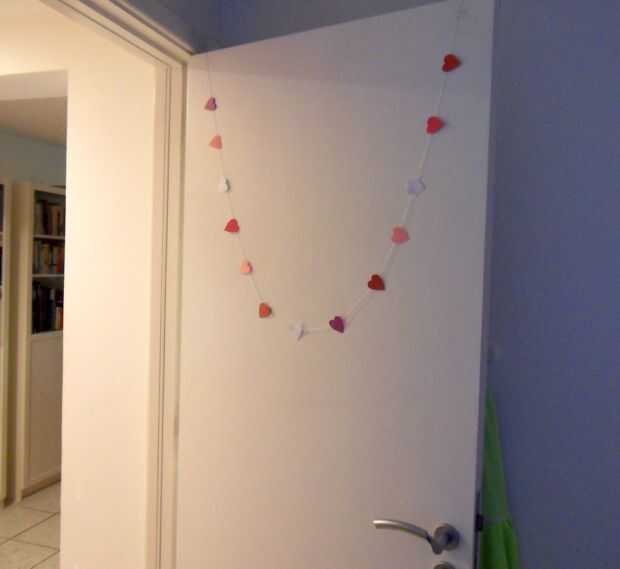 Trazó la forma del corazón en los papeles de colores diferentes, recorto, había grabado en orden aleatorio sobre la secuencia de hilado y colgó, pegar los extremos del hilo en la parte superior de la puerta.