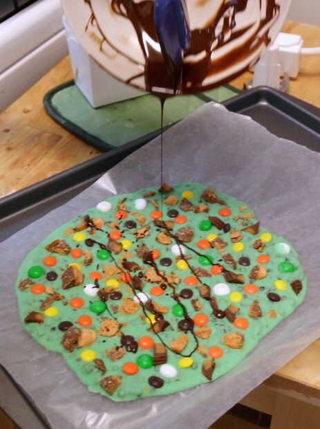 Rociar la tapa con un color de contraste del chocolate. Utilicé chocolate negro (restos del experimento vegano), pero también podría teñir chocolate blanco más otro color asqueroso. Estoy pensando en púrpura podría haber ido bien aquí.