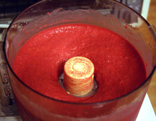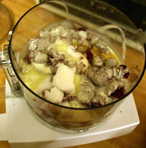 Combinan las bayas congeladas, azúcar, crema y vainilla en un procesador de alimentos o licuadora. Proceso hasta que la fruta es más o menos picada y mezcla se asemeja a helado.
