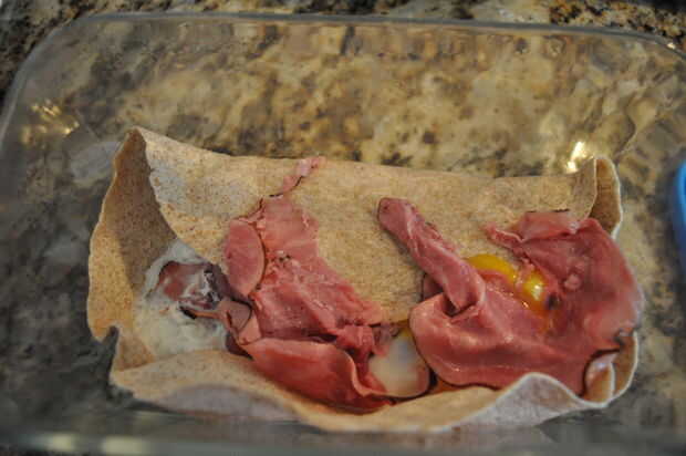1. cuidadosamente retire el recipiente del microondas y del tiro en las últimos 2 lonchas de jamón.