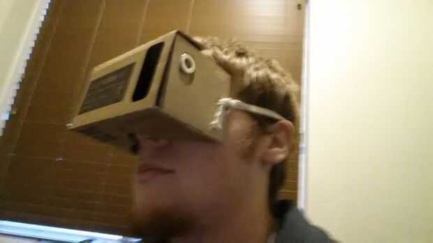 Nuestro espacio de fabricante aquí en Boise Idaho tiene un par de televidentes de smartphone VR aseados allí. Después de ensamblar y fastidiando con lo encontré pronto que mi mano se está cansando de sostener hasta mi cara. Necesitaba más de sólo un par de minutos en el mundo virtual con mi brazo heridos. Corrió a mi coche y cogió un delantal viejo de Homedepot y quitó las correas y se puso a trabajar.