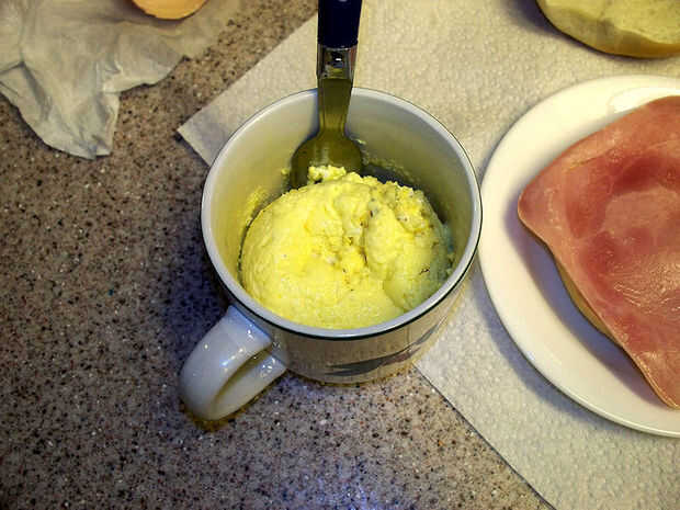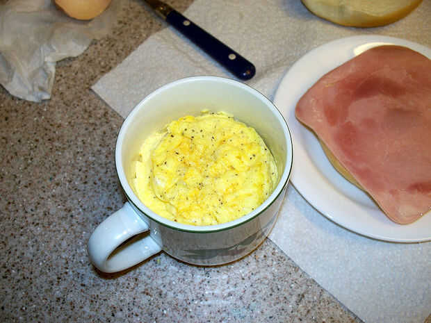 Con el tenedor, correr alrededor de los interiores de la taza para separar los huevos a la Copa y entonces Voltee los huevos con el tenedor para que la parte inferior de los huevos ahora enfrenta. Si la parte inferior (ahora mirando hacia arriba) se ve bonito y firma/cocidos, entonces estamos listos. Si parece un poco mocosa o demasiado blando para su gusto, pop la taza en el microondas durante 30 segundos y que terminen de cocinar bien para usted.