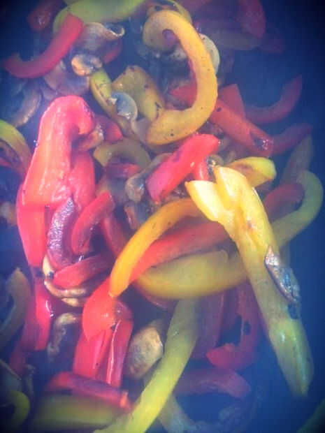 Lo primero que tienes que hacer es cortar tus setas y pimientos en rodajas finas y freír en una sartén con un poco de mantequilla para unos 5-8 minutos (hasta que estén blandas).