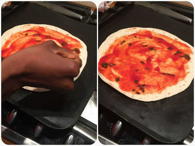 1. Agregue una pizca de albahaca picada y sal en el puré de tomate, después extienda la mezcla sobre la envoltura de la tortilla.