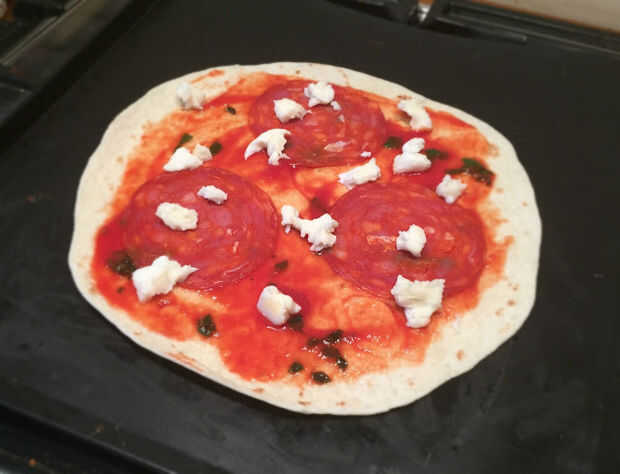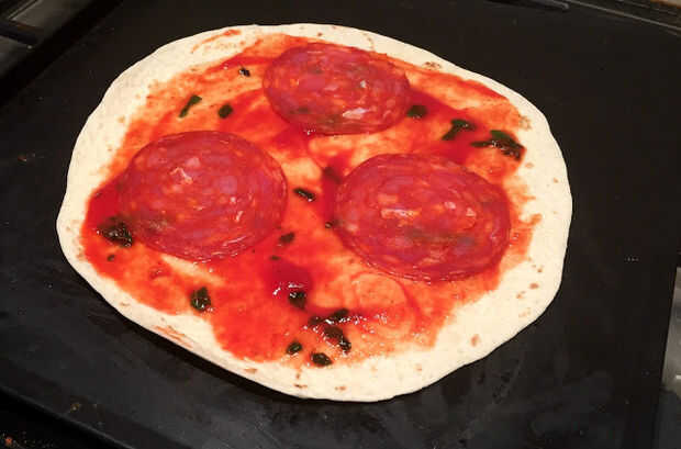 me parece una forma rápida y fácil para hacer y disfrutar de una pizza sin usar el horno. Todo lo que necesitas es salsa pizza, queso, tortillas y cualquier extras toppings usted puede.Paso 1: a continuación deberás poner la tortilla en la estufa en
