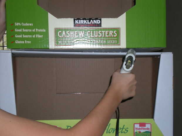 Este es el paso que necesita la pistola de pegamento para. Colocar un viejo pedazo de papel o cartón para evitar pegamento en el piso. Comenzar pegando abajo cualquier piezas sueltas de la caja. Luego, apile las cajas en el orden que desea que sean. Poner pegamento en las esquinas superiores y los bordes de la caja inferior. Presione la parte inferior de la segunda caja en el pegamento y sujete firmemente hasta que el pegamento se seca. Hacer esto para los cuadros restantes. Al llegar a la cima, recoger el condominio de gato para asegurarse de que las cajas son seguras. Hacia el lugar que le gustaría que sea en a la estructura. Me gusta poner pesos en la parte inferior para que los gatos no pueden caer.