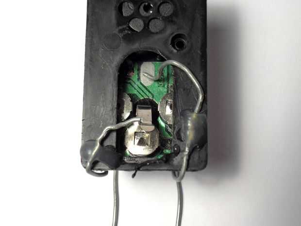 Los dos cables abierto terminada son alambre de 1.5mm sin aislar sólo regular. Os adjunto al juguete con algun pegamento caliente (sin soldar).