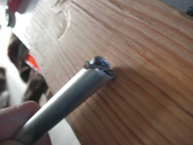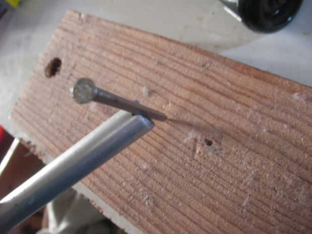 El chisme funciona colocando los clavos u otros sujetadores en la ranura en V, apuntando el clavo y tienen en él con el martillo, sin temor a clavar el dedo pulgar.