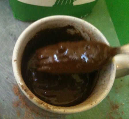 fácil de hacer tortas gratis leche, en una taza. Tan fácil a los niños y hacer (y comer).Ingredientes* 4 cucharadas de harina* 2 cucharadas de azúcar impalpable* 2 cucharadas de cacao sin azúcar* 1/4 de cucharadita de bicarbonato de sodio* 1/2 cuchar