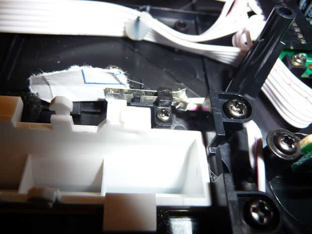Ahora obviamente un gas todo sería ridículamente grande para caber dentro de la guitarra, por lo que arrancó una esquina sobre. Encontré que una pequeña pieza, doblada encima (a iguales dos hojas), hizo el trabajo perfectamente. No preocuparse que salir otra vez ya que la presión del contacto contra el resalto de montaje detrás de él era bastante fuerte. Si sale otra vez, sólo voy abrir copia de seguridad. Toqué una canción con esta solución, y funciona muy bien.