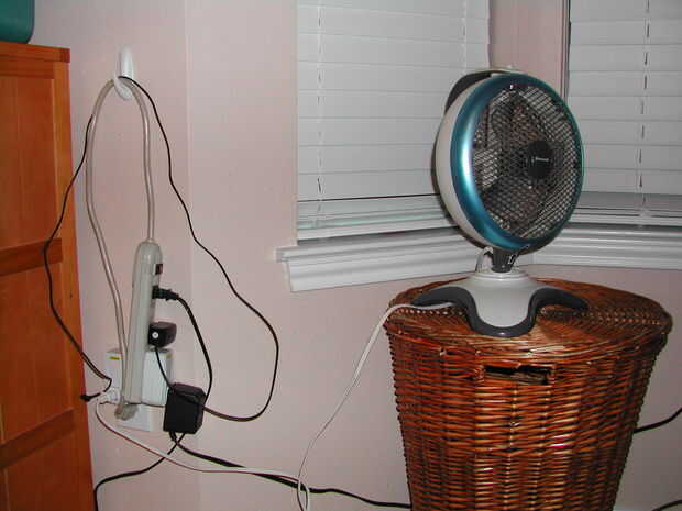 Aquí es donde los ganchos entran en juego. Alguien tengo enchufe en un protector contra sobretensiones o si puedo llegar, conecto. Luego, un gancho desmontable se coloca más arriba para que el protector contra sobretensiones puede colgar de él (ver foto). El cable corto del protector es sólo la longitud adecuada para colgar. Hace la toma de corriente accesible sin agregar mucho de la longitud de alambre extra como una extensión. Obtener la protección de sobretensiones para mi electrónica y más salidas para conectar hasta gadgets adicionales. Y con un solo botón, yo puedo apagar todos mis gadgets para que la electricidad no se aspira a que se sientan en el modo listo.