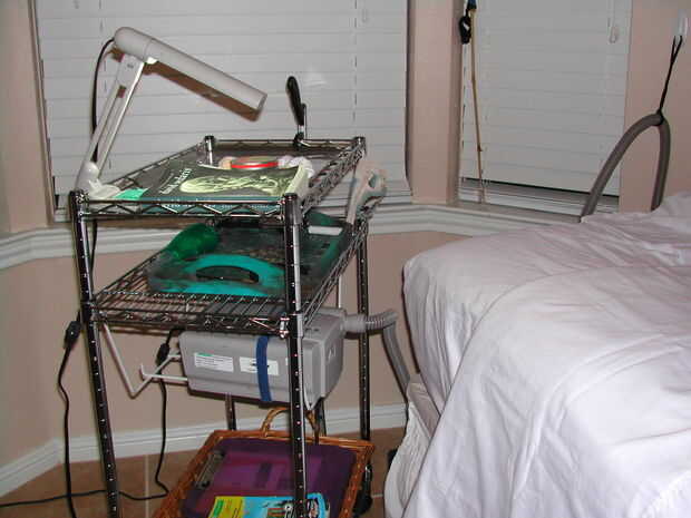 He modificado el carro más lejos agregando un estante colgante en la parte inferior del segundo estante (intermedio). (Tenía a la izquierda por parte de una silla de ducha/inodoro que encajan perfectamente). Así tenía 4 estantes en lugar de tres. Si no había de tenía la plataforma repuesta probablemente pude haber usé uno de esos estantes poco baratos diseñados para ir dentro de un armario de la escuela. Sería sencillo simplemente Voltéela boca abajo y coloque las piernas en la parte inferior de la plataforma del carro con zipties. He incluido una foto de uno para que puedas ver lo que estoy hablando.