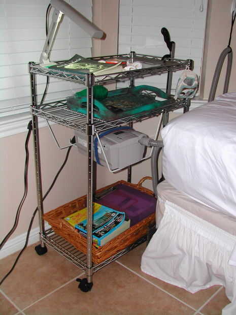 Una vez más decidí que la respuesta es un estante sobre ruedas. Tenía un pequeño estante que nivel dos a mi estante de "dresser" más grande pero encontrar ruedas para él resultó para ser costoso. Por lo tanto, fui en línea y comprar un cable de carro, un carro de las clases, con tres estantes ajustables del balanceo. No sólo es la estantería con ruedas más grandes y más funcionales pero vino con tres estantes, en vez de dos. Es muy robusta y el costo total no fue mucho más que hubiera tenido que pagar para comprar las ruedas para la unidad más pequeña.