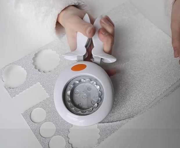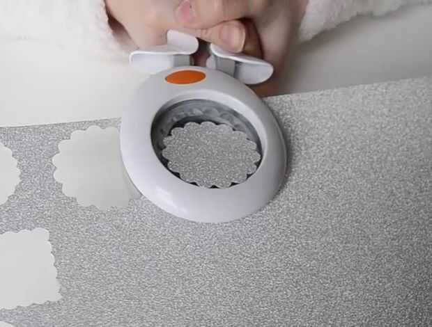 3) tome el Fiskars Extra-Large festoneado círculo de apriete y un papel de plata. Hacer un círculo de plata.