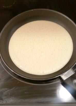 Calentar una cacerola antiadherente a fuego medio, añadir aproximadamente 1/2 taza de la masa mezclada a la sartén.