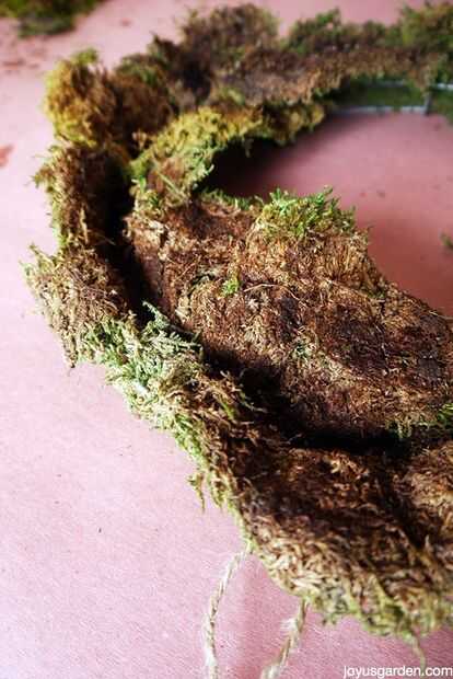 1- Línea de la forma de la corona de alambre con el musgo. Tip: Moje el musgo para hacerla más flexible. No te preocupes si no limpio el musgo y hasta porque no crece en la naturaleza de esa manera. Sólo asegúrese de que se forran el fondo y lados de la forma y que usted tiene suficiente musgo para plegar y los cepellones de las plantas de la cubierta.