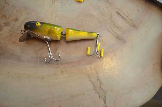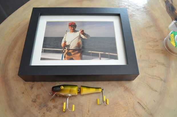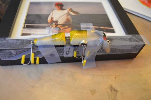 Excavado a través de mi álbum de fotos y encontré una foto de mi papá pesca y recogió un marco barato de Ikea. Necesitaba tener un borde de marco grande con el fin de epoxy en el señuelo de la pesca. Pero primero tuvo que ser hecho seguro. Señuelos de pesca son notoriamente afiladas así que corte a cierto aislamiento de cable amarillo sacado el cable y pegan sobre las barbas. Si tengo que tiene habría usé como usted todavía podrá ver las lengüetas de plástico hilo transparente y menos evidente. Pero también me gusta cómo el amarillo coincide con el señuelo y es obvio que se ha hecho seguro. Todo lo que se dejó para hacer es epoxy al marco y cinta adhesiva en su lugar hasta que el epoxy se establezca.