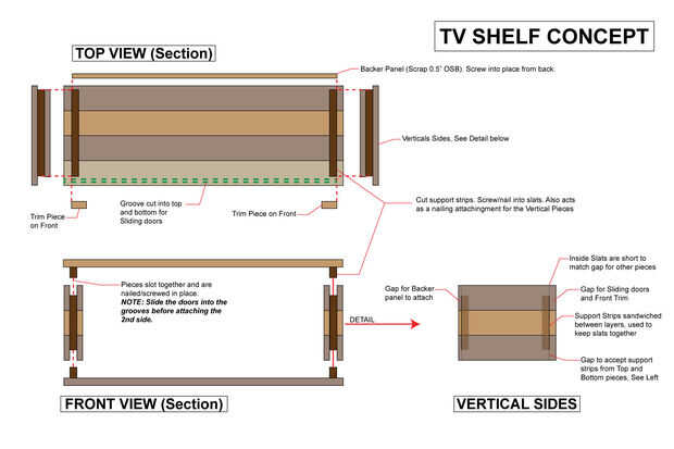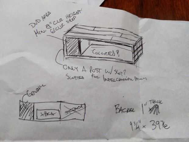 Así que este proyecto era ir en mi TV. Necesitaba algo para la Xbox y el módem para internet, además de algo de espacio extra para los pocos DVDs, juegos y tal que tenemos. Hice algunos tamaño áspero y bosquejar un diseño. El diseño terminó cambiando a medida que comencé a edificio. El gráfico más agradable muestra la construcción final.
