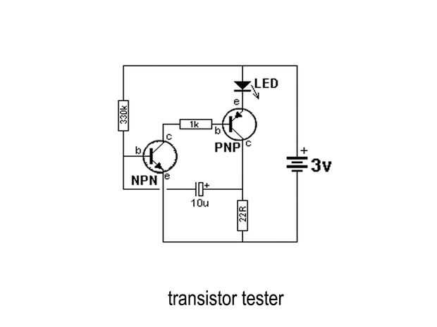 retroalimentación hace que el LED de flash a una tasa determinada por el 10u y resistencia de 330 k. Uno de los transistores e insertar el transistor desconocido. Cuando es NPN con las clavijas tal como se muestra en la foto, el LED parpadeará. Para apagar la unidad, Quite uno de los transistores.