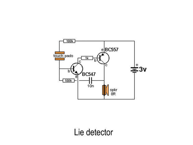 dedos para producir una oscilación. La detectionpoints detectan resistencias tan altas como 300k y la resistencia disminuye, la frecuencia aumenta. Separe las dos almohadillas y adjuntar al dorso de cada mano. El sujeto se siente nervioso, él sudor y cambiar la frecuencia del circuito. Las fotos muestran el circuito construido en tableros de PC con almohadillas separadas.