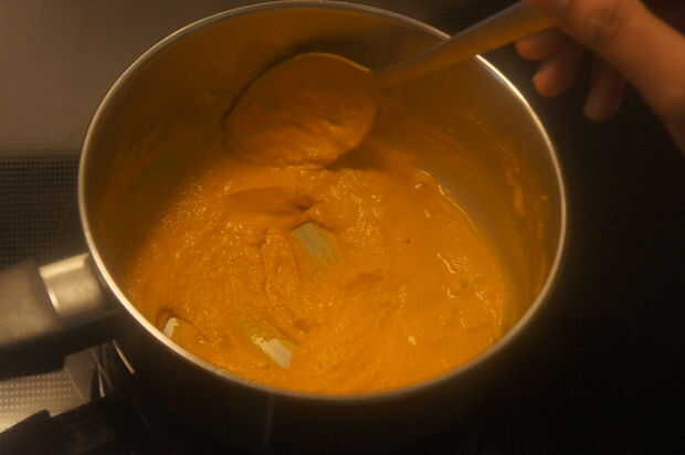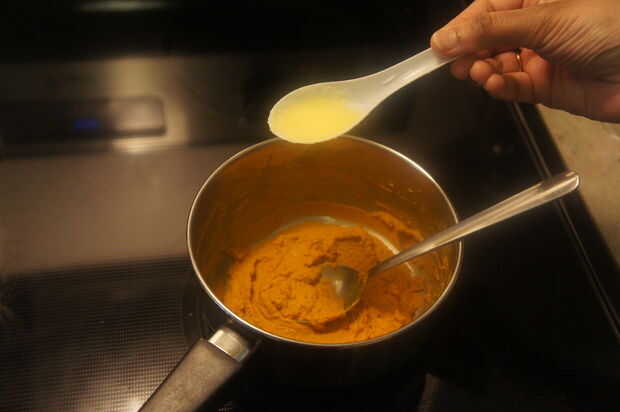 Cuando se la cúrcuma está totalmente cocido, agregar la pimienta y clarifica la mantequilla y retirar del fuego.