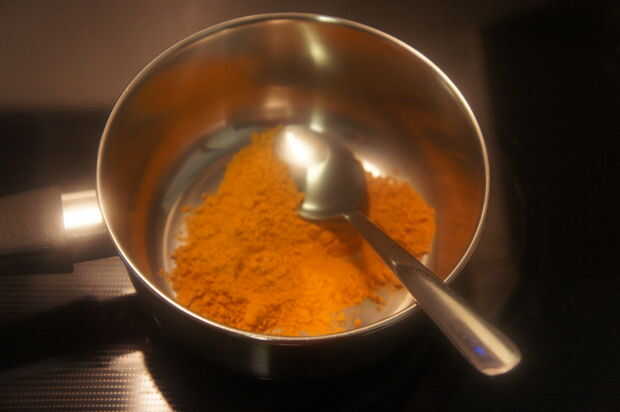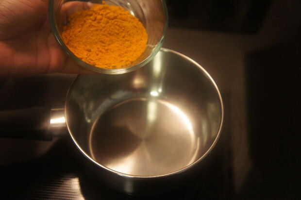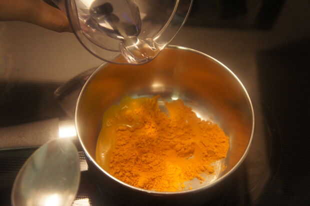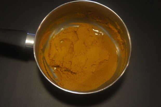 * Coloque una cacerola a fuego medio y mezcle el polvo de la cúrcuma y el agua.