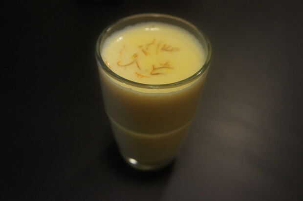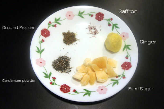 * Luego añadir azúcar de Palma (karkandu de panam). una vez se disuelve el azúcar de Palma cuele en un vaso y encima de azafrán y servir.