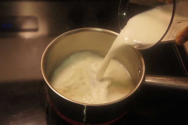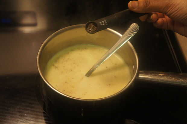 * Añada la leche, pasta de cúrcuma, cardamomo molido, pimienta molida y deje que hierva.